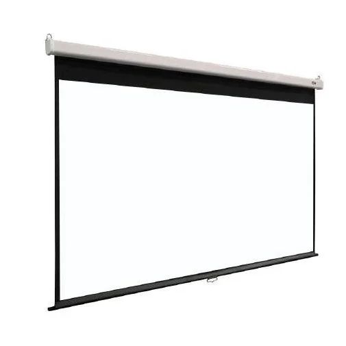 Écran de projection manuel, classement au feu M1, format 1:1, dimensions 200 × 200 cm, poids de 10,25 kg. Doté d’un carter en acier laqué noir et d’une surface blanc mat avec dos blanc classé non feu. Conception compacte facilitant le transport