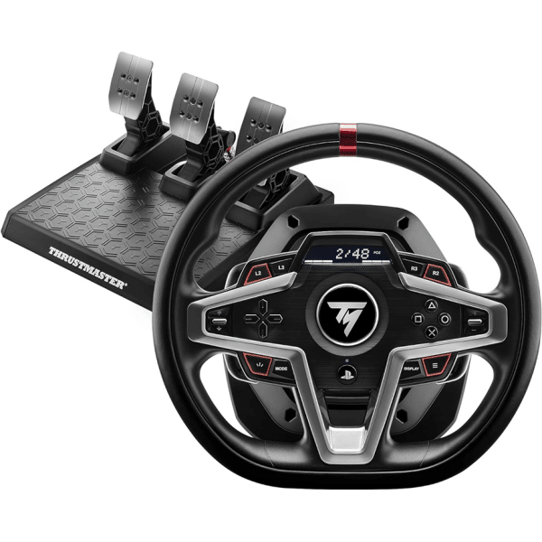 Thrustmaster T248 Design premium avec finition cuir sur la partie extérieure de volant Forme de la roue polyvalente, adaptée à tous les styles de jeux Jusqu’à 25 boutons d’actions incluant 2 encodeurs à double activation Tableau de bord interactif incluant une sélection de plus de 20 affichages différents sur l’écran du volant Retour de force dynamique : réglage du niveau de retour de force à la volée (3 modes presets inclus) via l’écran et compatibles dans tous les jeux Palettes de vitesses magnétiques (technologie brevetée H.E.A.R.T) pour une réactivité instantanée avec des passages de rapports clairs Pédalier magnétique (technologie brevetée H.E.A.R.T) pour une précision 12 bits qui ne faiblit pas dans le temps 4 modes de pression distincts sur la pédale centrale pour un freinage optimisé selon la configuration et le setup de jeu (bureau, cockpit, stand, etc.) Système Hybrid Drive nouvelle génération permettant un gain de puissance de 70% par rapport aux autres volants hybrides Thrustmaster (Séries T150) Sous licence officielle PlayStation PS5, PS4 et compatible PC